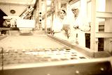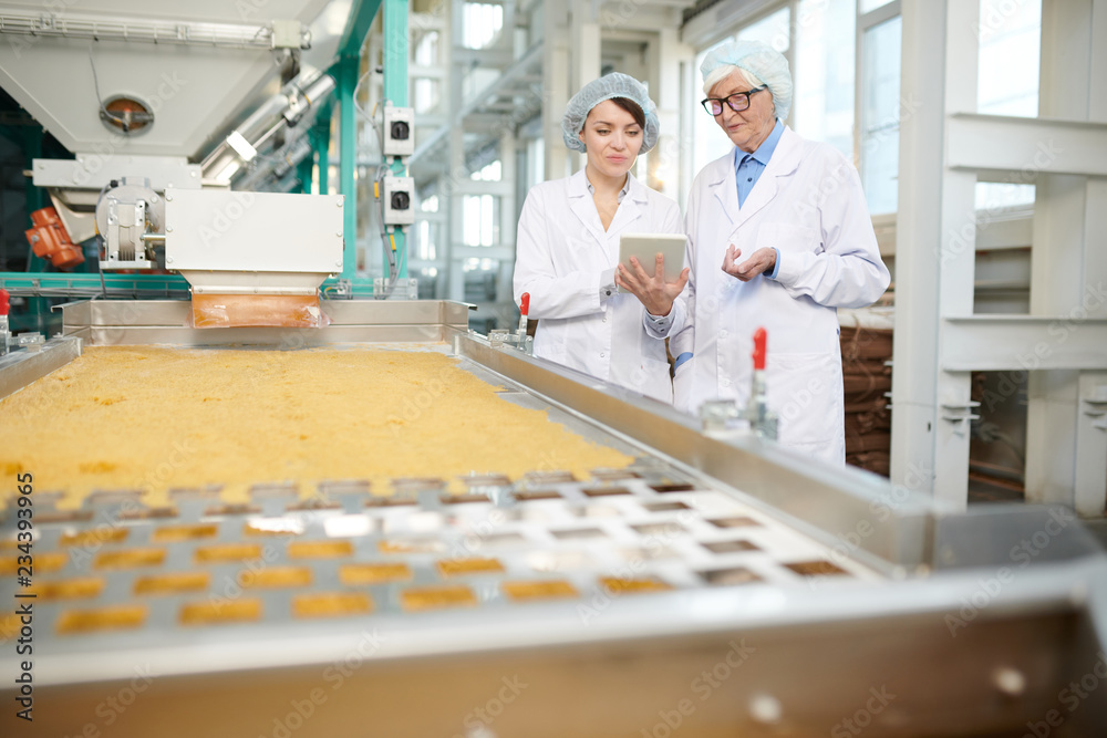 Portrait of two women doing production quality inspection in food factory standing by conveyor belt and using digital tablet, copy space