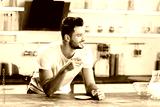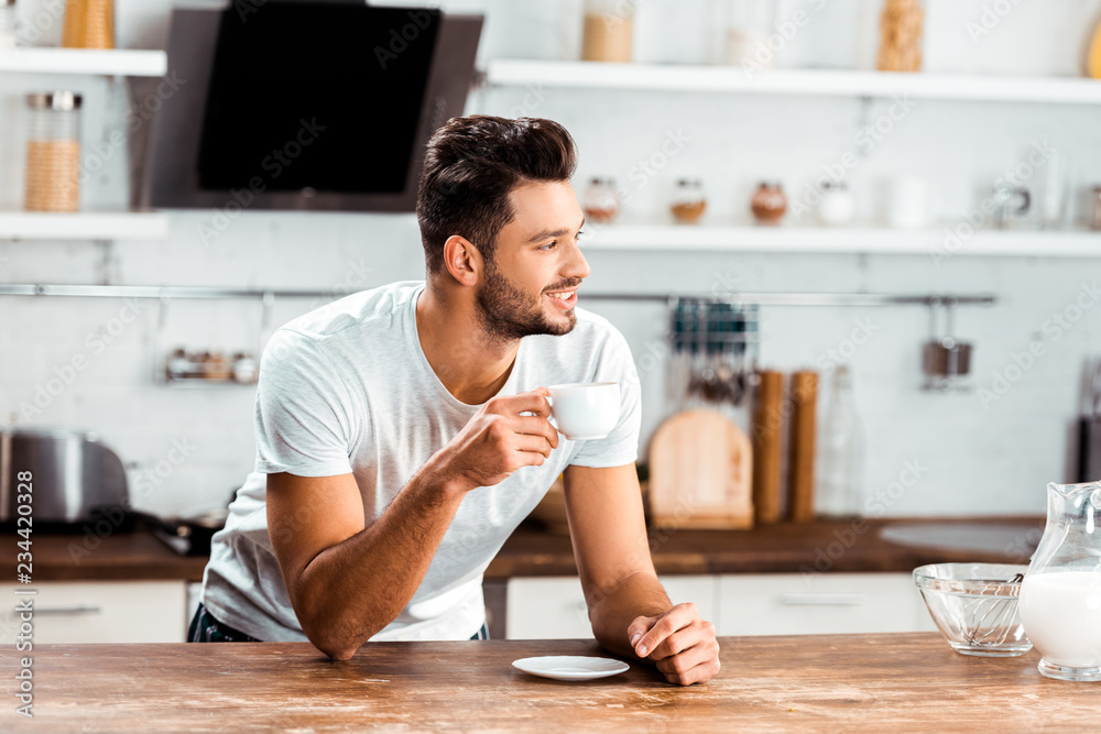 smiling young man holding cup of coffee and leaning at kitchen table at morning
