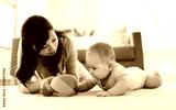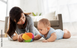 family and motherhood concept - happy mother and baby son playing with ball at home
