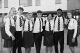 Portrait Of Smiling Male And Female High School Students Wearing Uniform Outside College Building