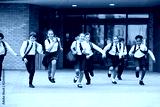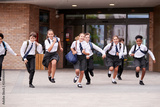 Group Of High School Students Wearing Uniform Running Out Of School Buildings Towards Camera At The End Of Class