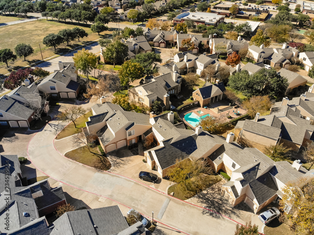 Top view new park side condo and townhome communities near Dallas, Texas, USA with colorful fall foliage. Townhouse complex at suburban neighborhood. Tightly packed homes housing and driveway