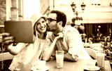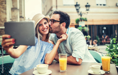 Young couple sitting in the cafe and having fun with tablet. Dating, relationships, love, romance, lifestyle, technology