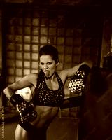 Fitness strength training workout concept background - muscular bodybuilder sexy sport girl doing exercises in gym in the boxing gloves