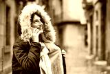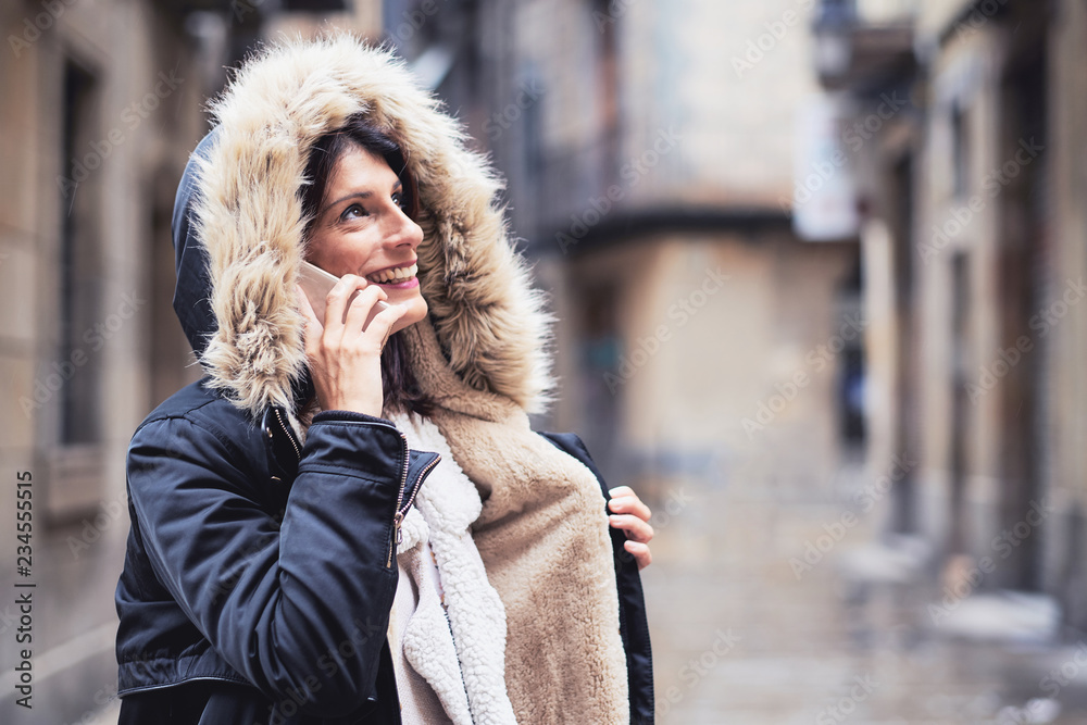 Mujer joven hablando por teléfono en un día de invierno lluvioso