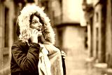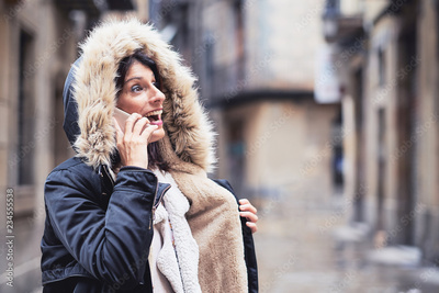 Mujer joven hablando por teléfono en un día de invierno lluvioso