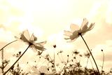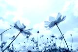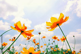 orange flowers blooming on blue sky background, low angle view