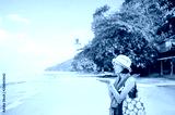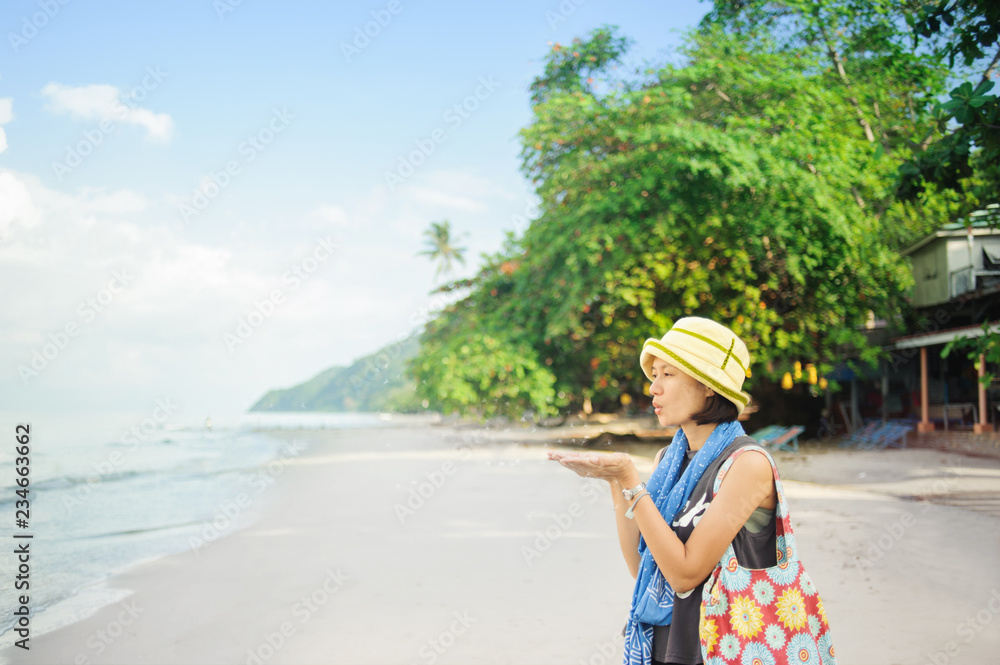 asian woman blowing dandelion flower standing on the beach