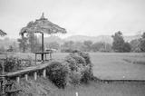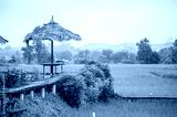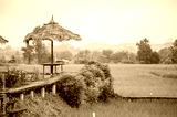 beautiful view of pathway wooden and green rice field in Pua, Nan province, North of Thailand