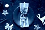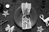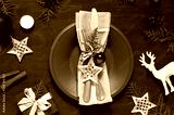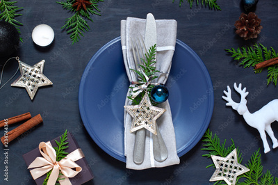 Christmas New Year empty plate flat lay on the dark wooden table. Holiday top view