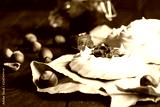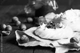 Portion of mini Pavlova meringue cake decorated with salted caramel sauce or chocolate paste over old brown wooden background.