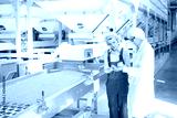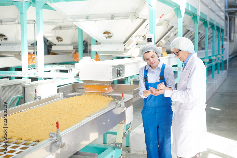 Portrait of two women working at factory standing by conveyor belt at modern food production, copy space