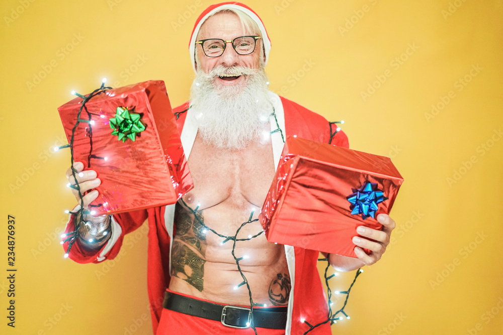 Fashion tattoo Santa Claus with gift box and vintage christmas lights