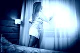 Young woman standing at the bright window in a bedroom and looking out of the window. Fresh good morning welcome.