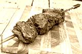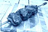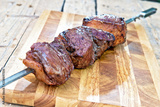 Cooked Picanha skewer ready to eat leaning on chopping board