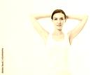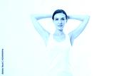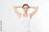 Blank template t shirt. Beauty Woman with perfect skin armpits and epilation isolated on white background. Laser hair removal. Brunette girl holding arms up and showing clean underarms. Copy space