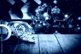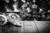 Cookies for Santa Claus in a glass jar on wooden table with Christmas tree and fireplace background. Christmas Eve evening.