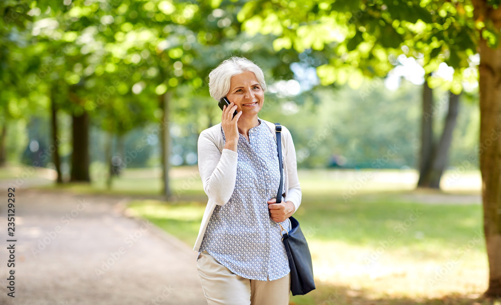 retirement, communication and old people concept - happy senior woman calling on smartphone in summer park