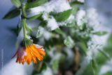 Snow covered, blooming wild flower in late November, signaling the fast change of seasons