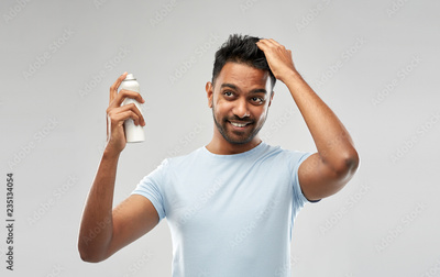 grooming, hairstyling and people concept - happy smiling indian man applying hair spray over grey background
