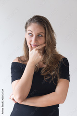 Beautiful Caucasian girl holding chin in thought and smiling. Young female wedding planner visualizing event. New project concept