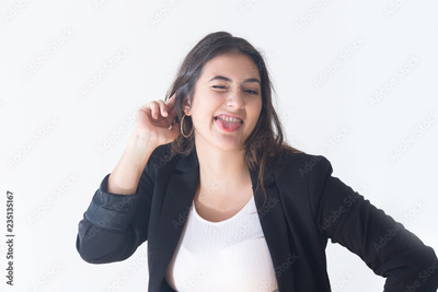 Cheerful Caucasian girl holding hand near ear and showing tongue. Young female student teasing friends. Taunting concept