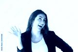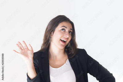 Cheerful Caucasian girl waving hand and looking up. Young female student saying mock farewell to college. Goodbye joke concept