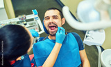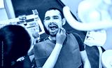 image of dentist using angled mirror while examining patient's teeth