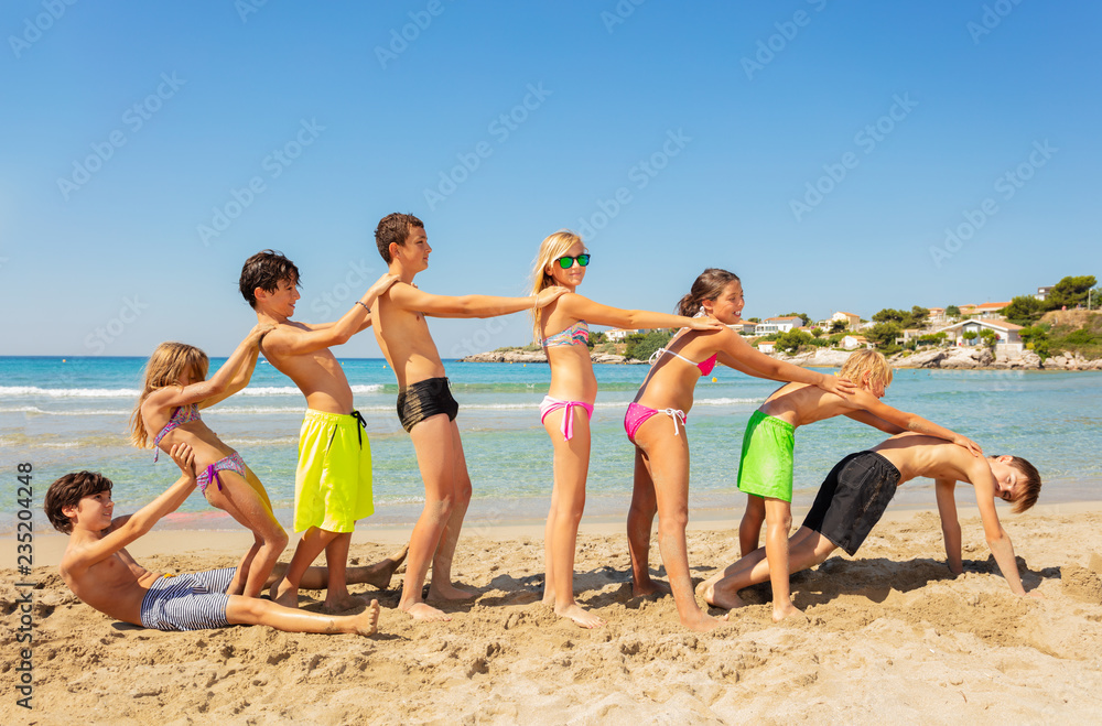 Happy friends playing beach games in summer