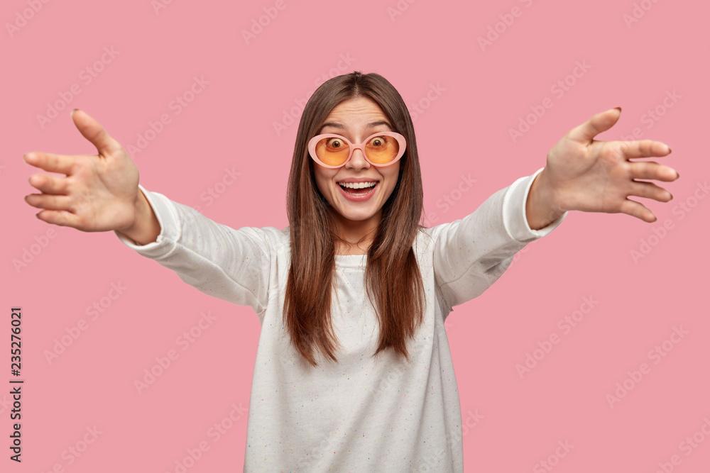 Happy brunette young woman shows welcome gesture, spreads hands as wants to cuddle best friend, smiles broadly, wears white sweater and sunglasses, isolated over pink background. Come to me!