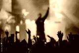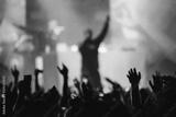Silhouette of a singer on a stage singing to the crowd with the hands raised up