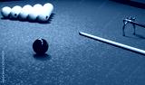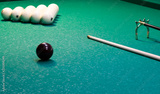 on a green background of a billiard table, white balls are lined with a triangle with a cue for playing