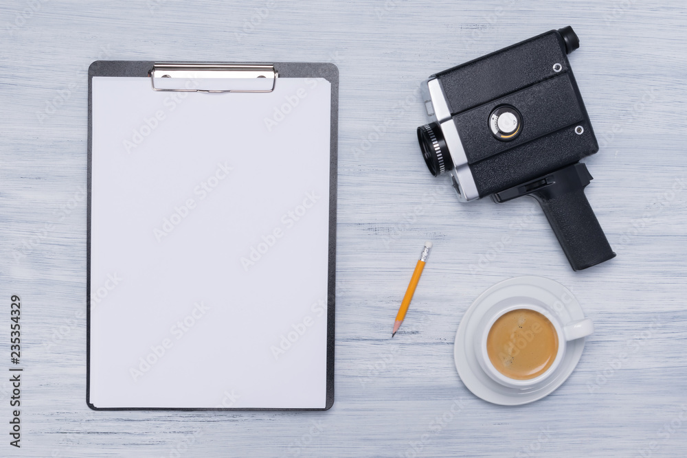 tablet with a sheet of paper lies on the table next to the retro video camera and a cup of coffee