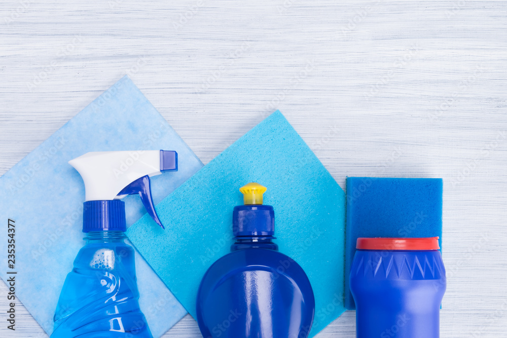 different blue bottles with detergents for cleaning on the background of blue rags