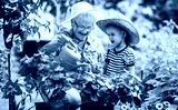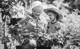 Gardening with a kids. Senior woman and her grandchild working in the garden with a plants. Hobbies and leisure, lifestyle, family life