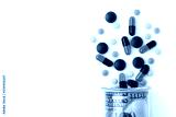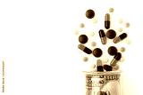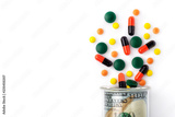 Colorful pills spilled from a bottle made of money, on white background. The Concept of Drug Purchase.