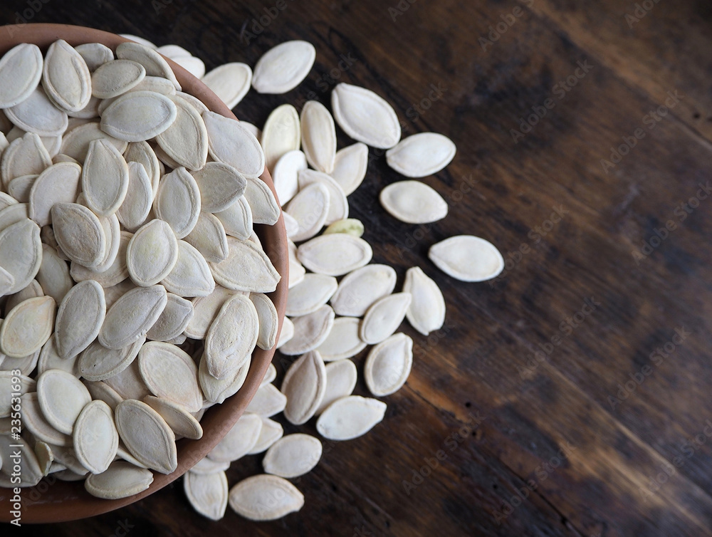 Dried pumpkin seeds on old dark weathered wood with copy space