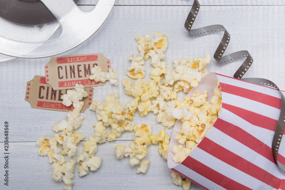 on a bright table scattered with a popcorn package with two movie tickets and film stock