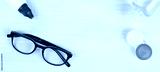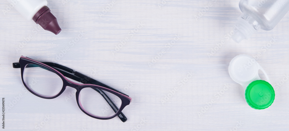 On a light background, there are items for improving vision, glasses and containers, waiting for improvement of vision