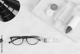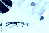 On the table, there are items to improve vision, glasses and containers, waiting for improvement of vision