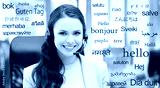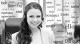 translation, communication and technology concept - smiling female helpline operator with headset at office over greeting words in different foreign languages