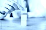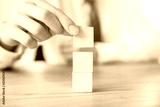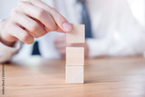 Hand of businessman arranging empty wood cube stacking on top with wooden table. Space for symbol.
