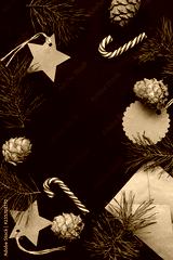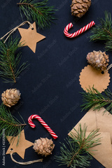 New Year or Christmas background of holiday labels, letters, pine cones, sweets and twigs.
