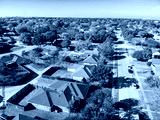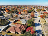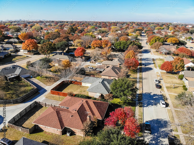 Top view beautiful neighborhood in Coppell, Texas, USA in autumn season. Row of single-family home with attached garage, garden, surrounded by colorful fall foliage leaves under blue sky