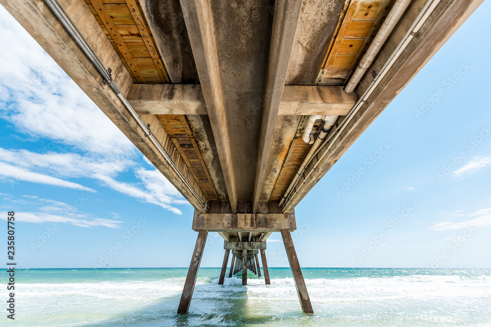 Under, underneath Okaloosa island fishing pier in Fort Walton Beach, Florida with pillars, green shallow waves in Panhandle, Gulf of Mexico during sunny day