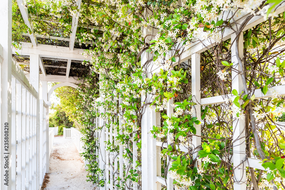 Closeup of patio outdoor spring flower garden in backyard porch of home, romantic white wood with pergola wooden arch path, climbing covering vine plants