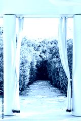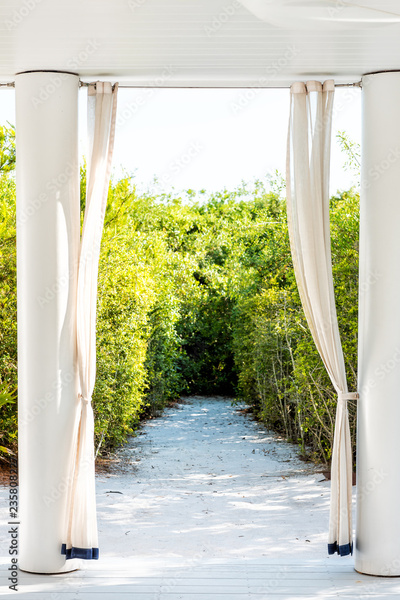 Vertical arch path leading to beach ocean with curtains, blinds wedding venue destination in Florida, sand, green shrubs, bushes, nobody empty framing