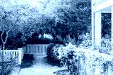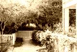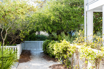 White beach wooden wood architecture, path way with green landscaping shrubs, bushes arch sidewalk for retirement or vacation apartment condo town community