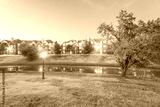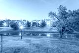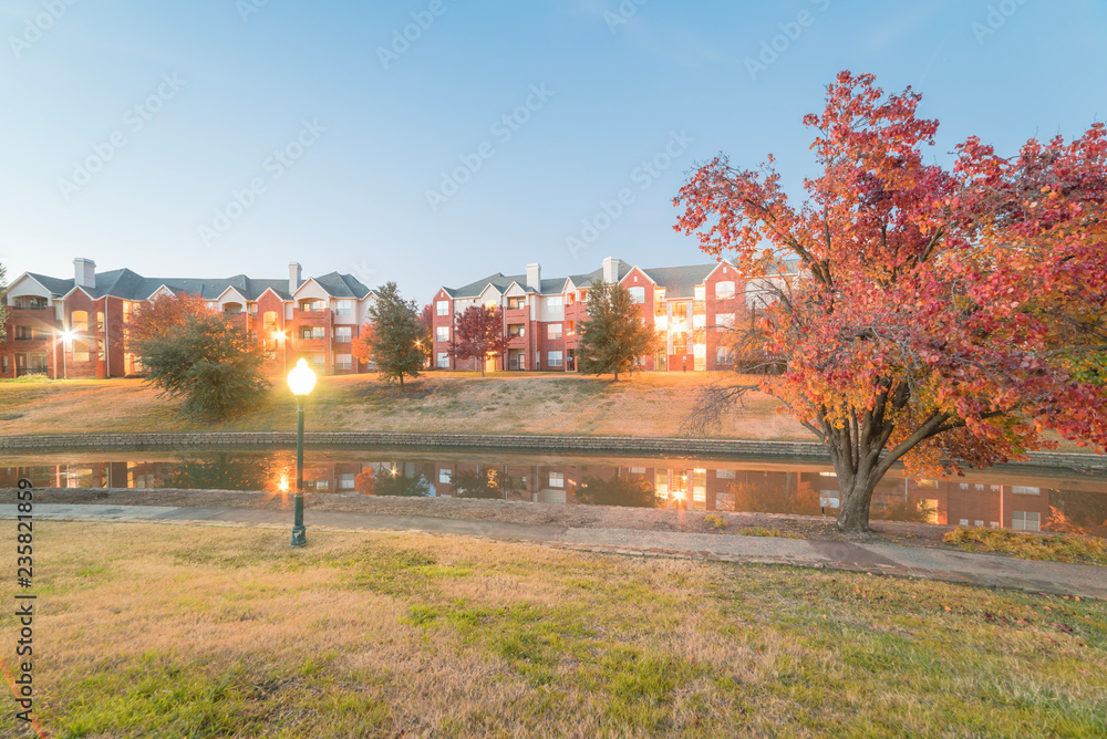 Typical riverside apartment complex reflection with beautiful fall foliage color at blue hour. Rental housing building in suburban Dallas, Texas, USA. Bradford pear (Callery pear) tree