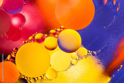 Abstract colorful background with oil drops and reflections on water surface. Cosmic abstract image